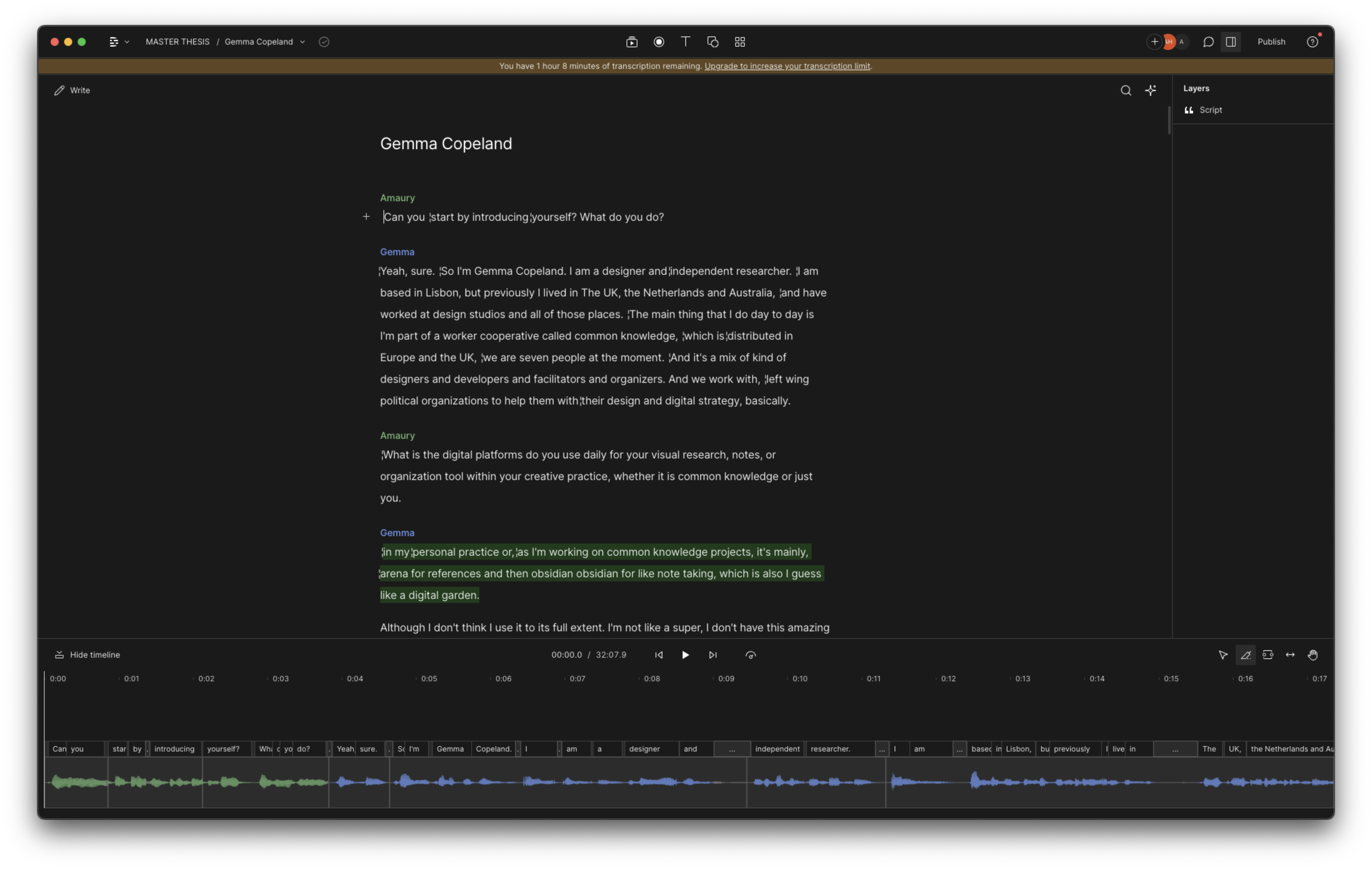 Using tools does not have to be by default and one may not suffice. Most of the interviewees generally research through a combination of platforms to develop a singular process. The choice of a specific platform can come out of curiosity about the latest tool, or some interviewees have a rather opinionated approach to selecting them, as explains Gemma Copeland, Lisbon-based Australian designer and member of Common Knowledge, a not-for-profit worker cooperative: