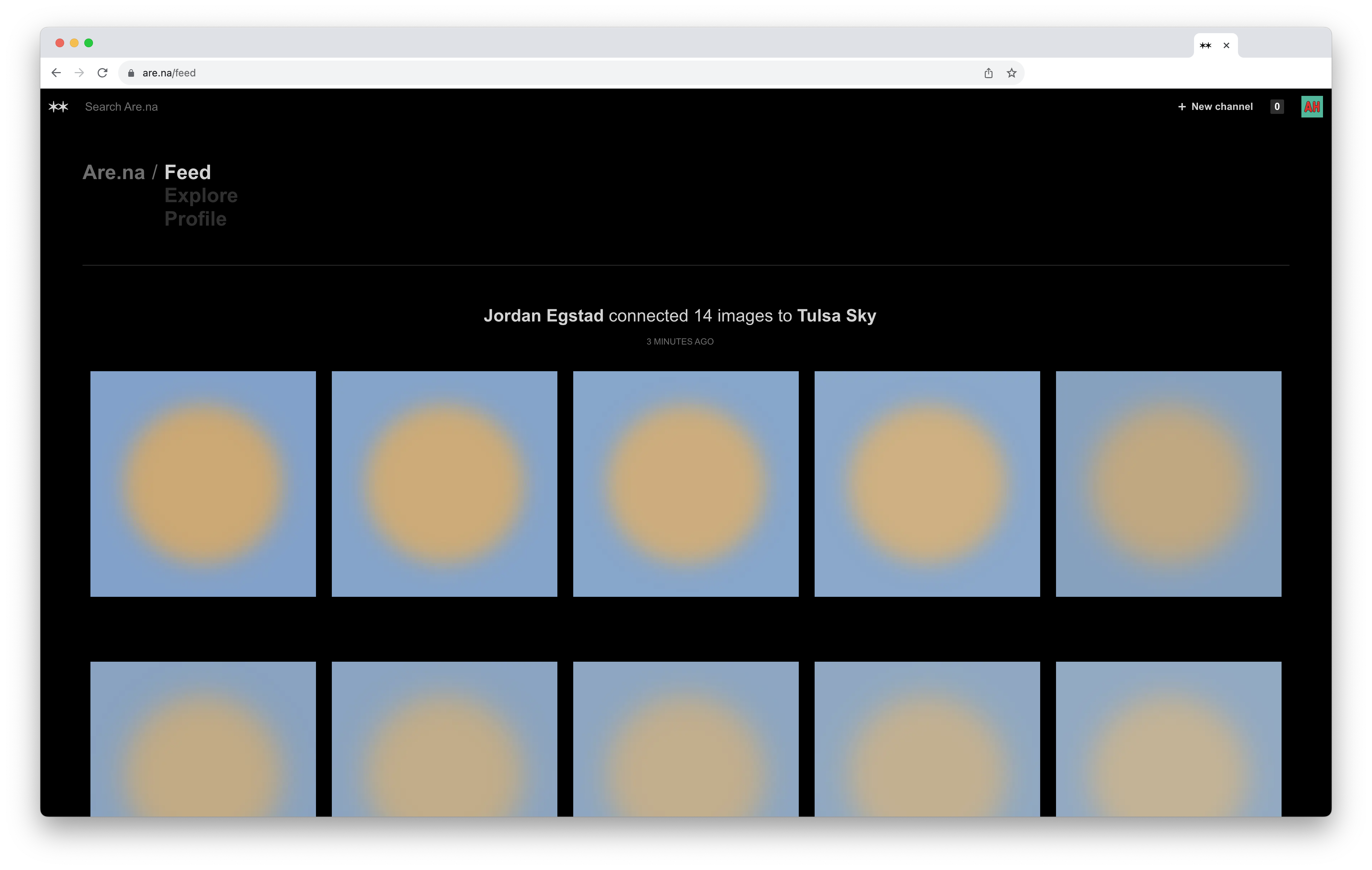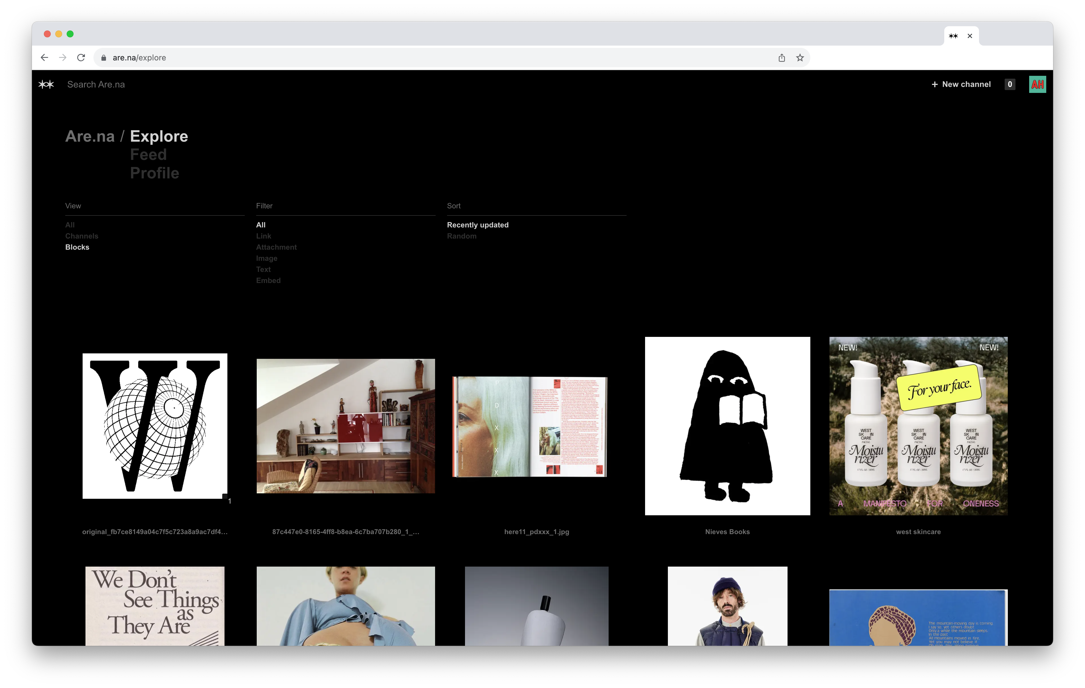 Main pages such as Explore (grid-view) and Feed (stack-view) feature chronologically ordered blocks pooled from either all users or the ones you follow. The Profile and channel pages list content in modular views to choose from (channel rows, blocks only, channels only, table, index).