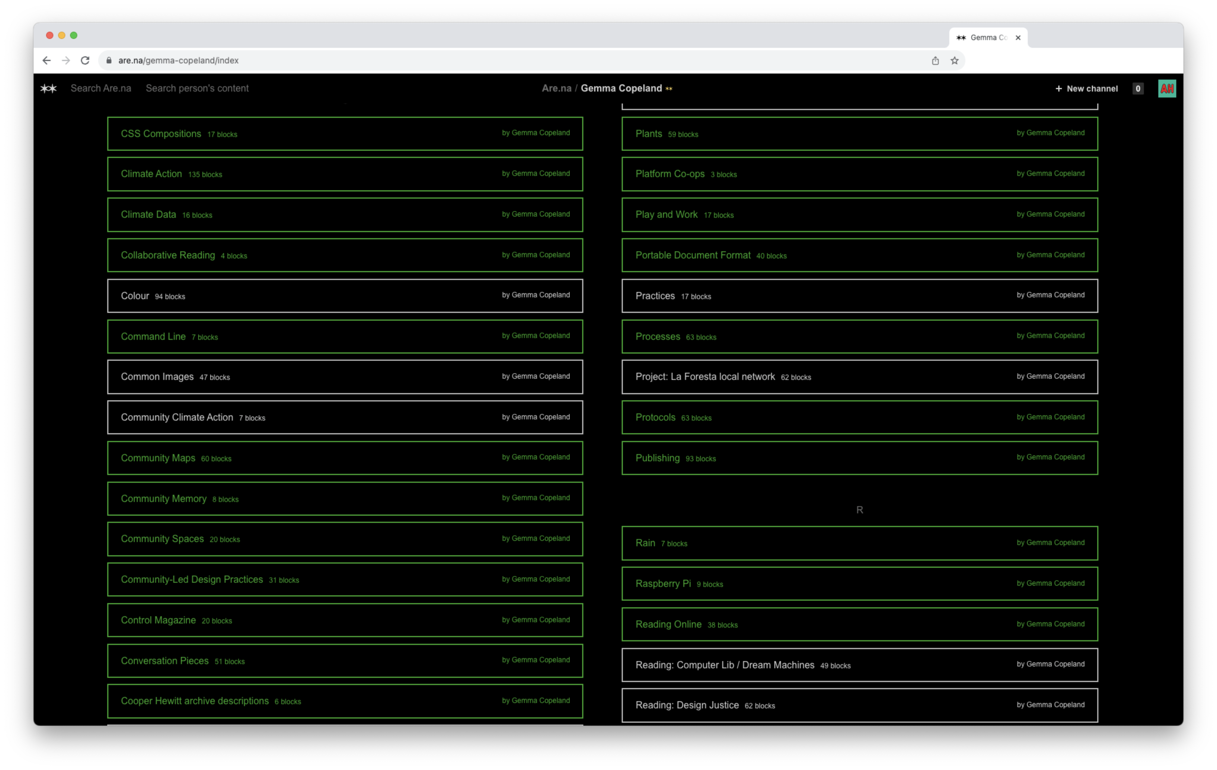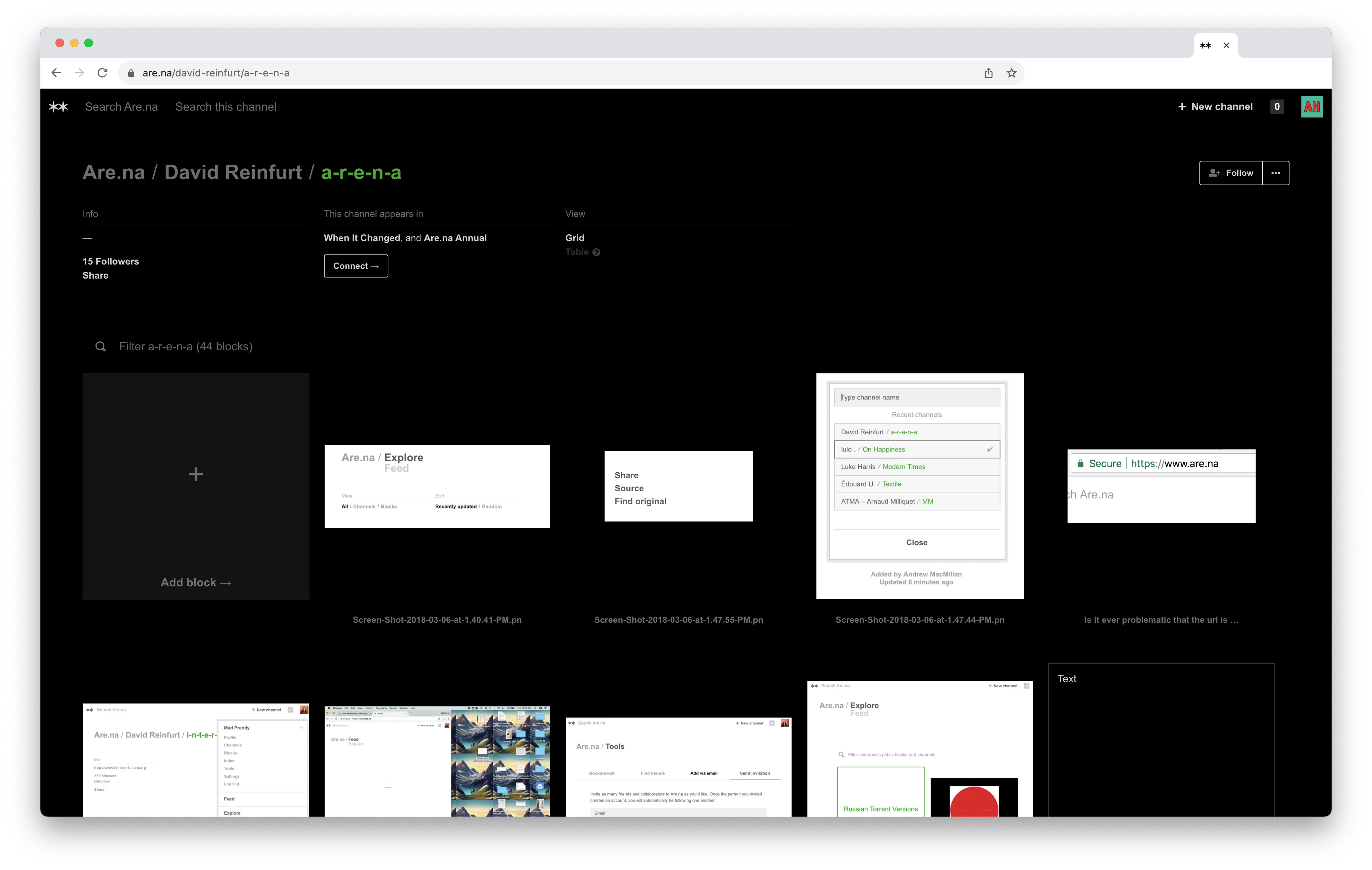 A detailed view of a block showcases all the channels it is branched in, along with metadata (source, connected by and date) and secondary features to comment on. The minimal UI is exhaustively puzzled out as a mise en abyme by David Reinfurt in an open channel a-r-e-n-a.35 According to Daniel, simplicity and reliability are what makes Are