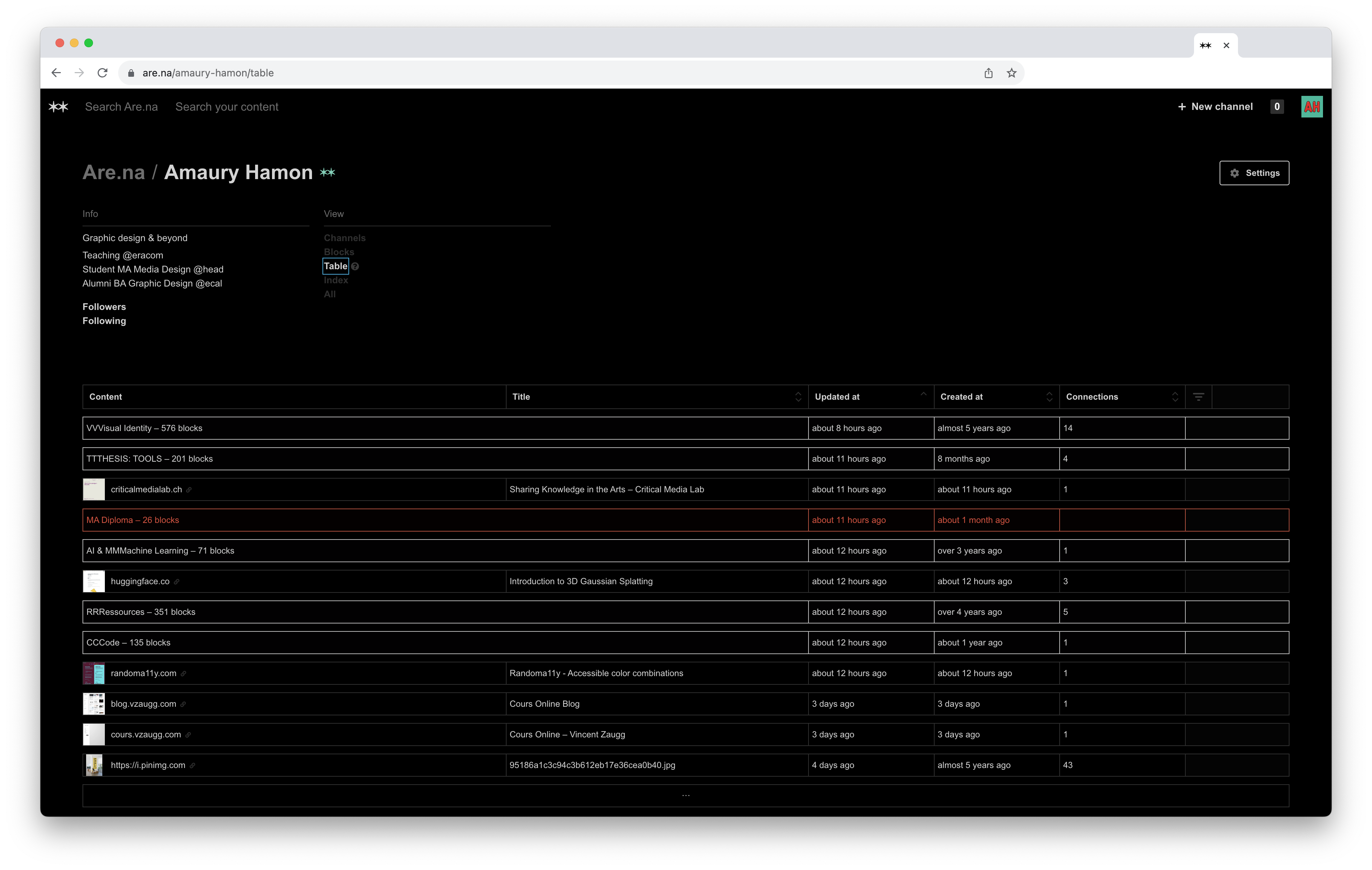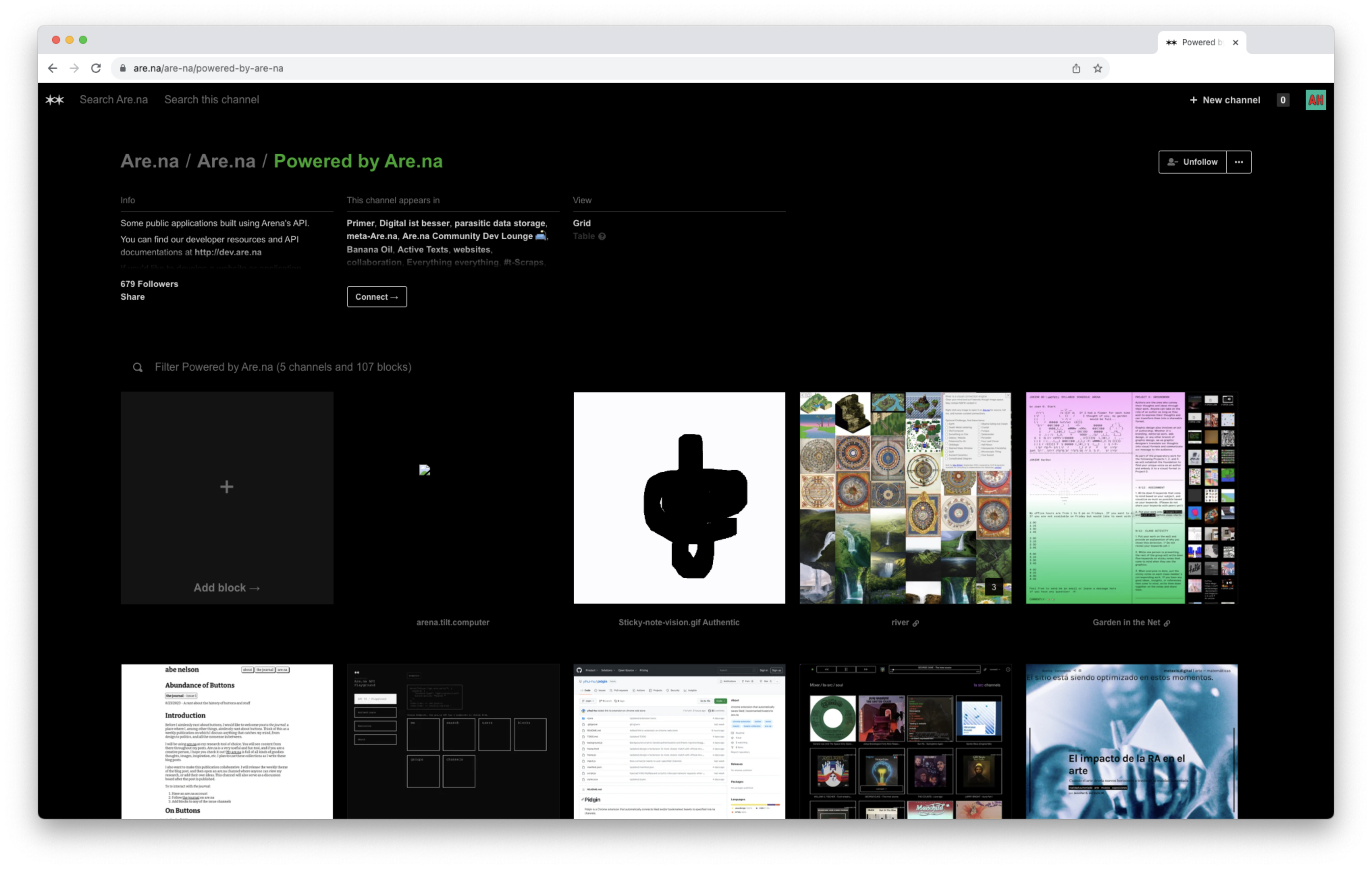 Defined as an “enclosed area for public entertainment,” the term “Arena”30 not only denotes physical space but also symbolizes a “sphere of interest, activity, or debate”. Within the domain of UGC platforms, data often resides in secluded silos, restricted behind access barriers. Exploring the distinctive realm of collaborative knowledge creation, this chapter unveils the profound impact and intricate design of Are.na —a platform reshaping the landscape of creative processes and information sharing–considered by many as a digital community garden31. While featuring use cases from the interviewees, it is pertinent to note that I am an active member and advocate of this platform.