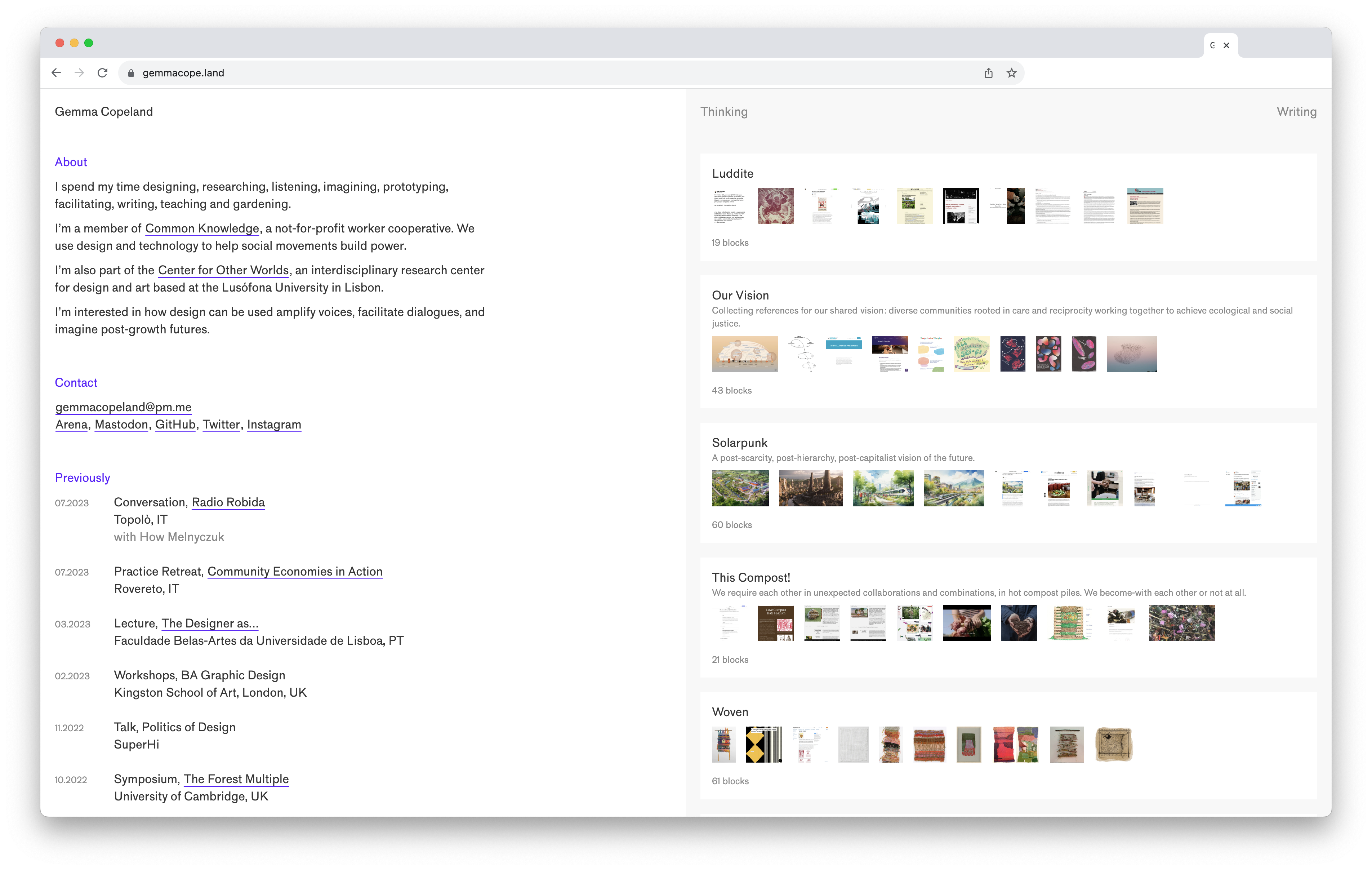 Part of wanting to build a blog was that my practice was too much just collecting and consuming, and it felt in a way passive, and not ever working through in greater detail what I thought about things, almost going too far onto this kind of intuitive collecting and not enough synthesis and articulating my own point of view. –Gemma Copeland