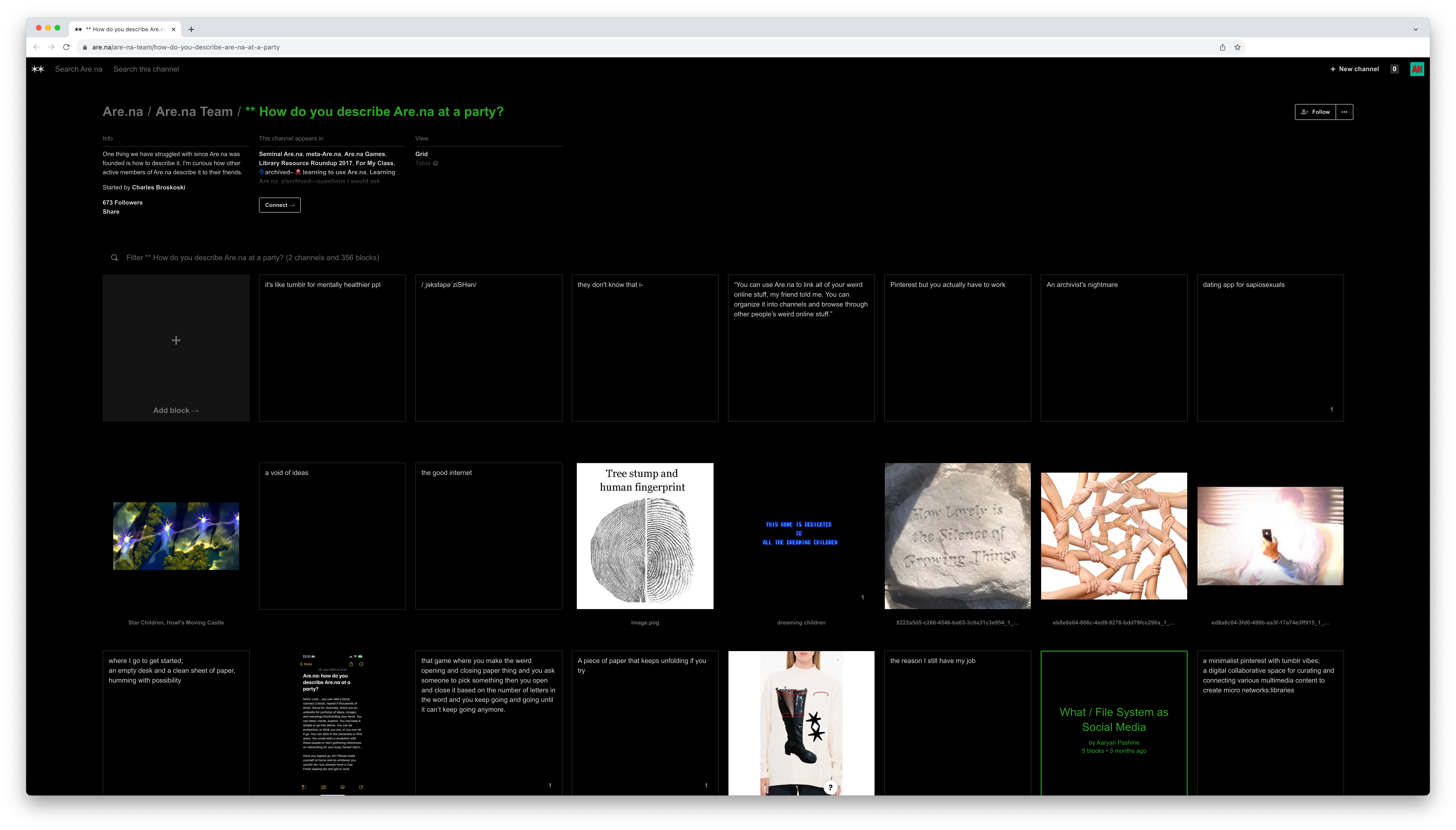 .na TEAM, How do you describe Are.na at a party? Are.na (Open Channel) [online] https:/ [consulted: 2023.11.25] &/ www .Are .na /Are .na -team /how -do -you -describe -Are .na -at -a -party #8617;& #65038; REINFURT, David, 2023, a-r-e-n-a, Are