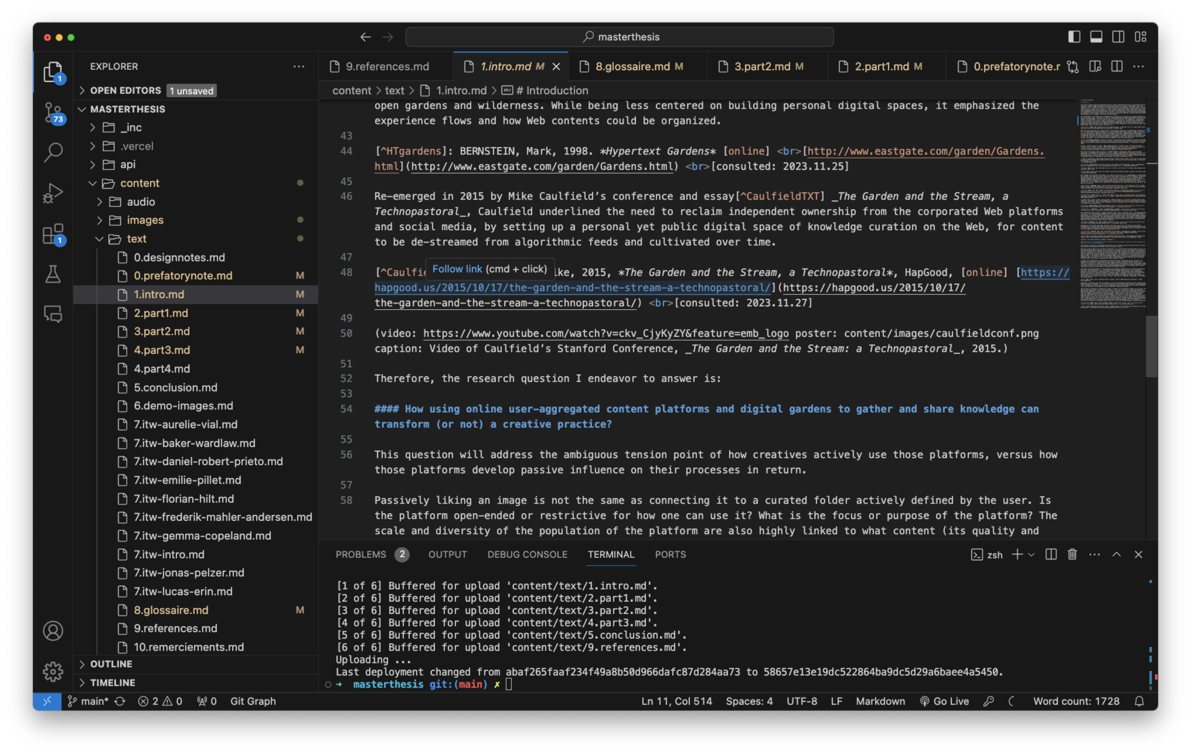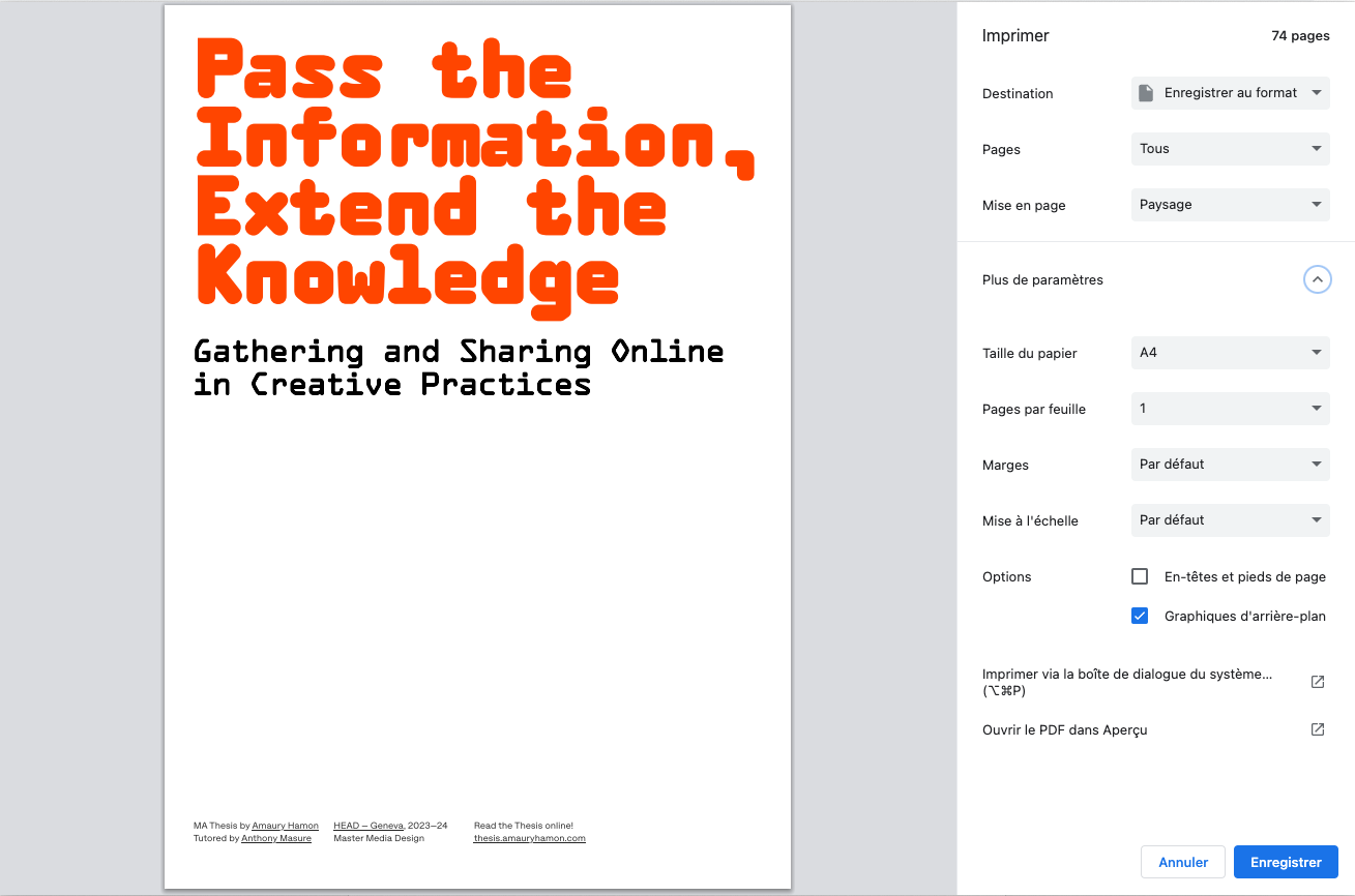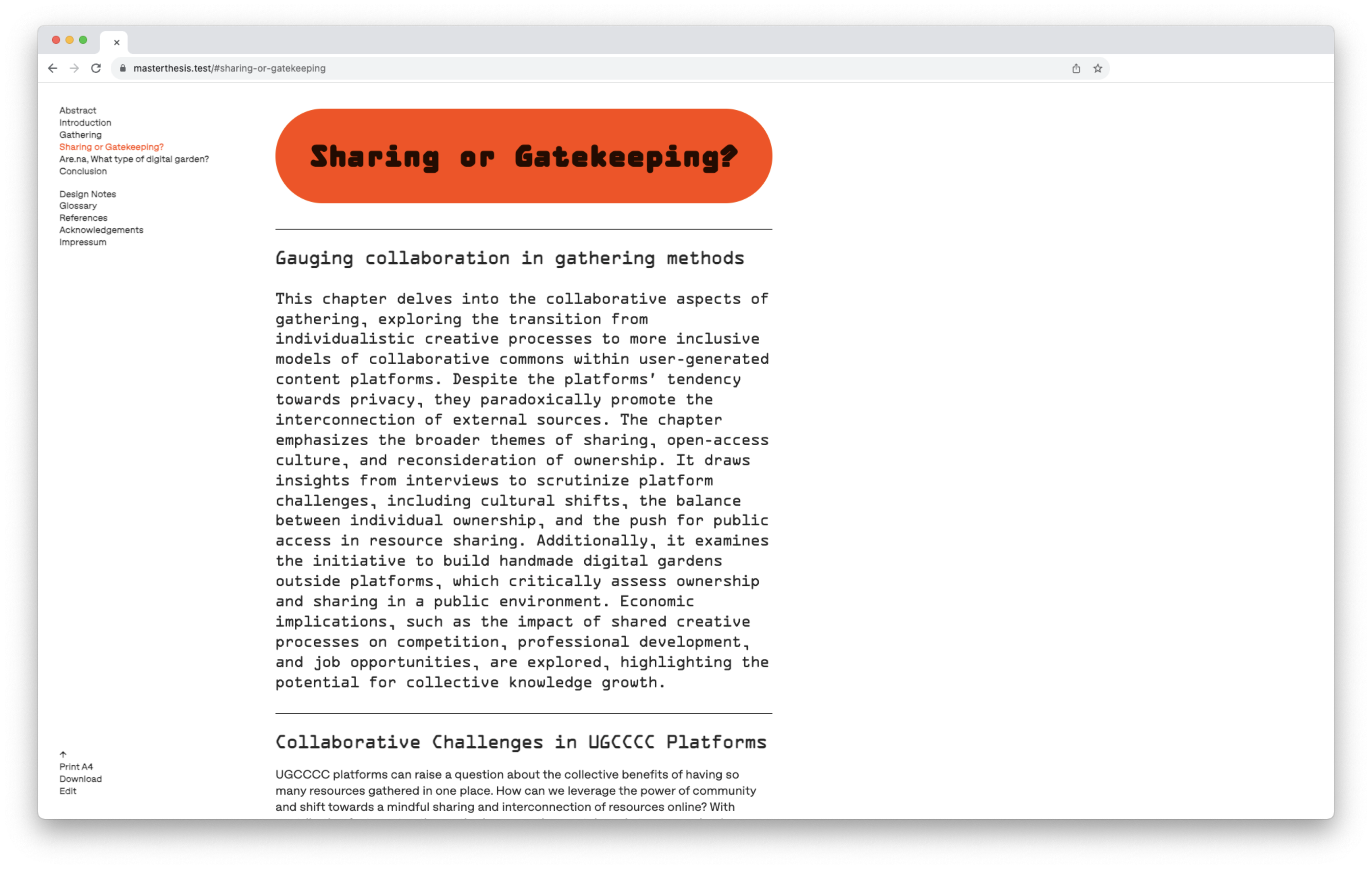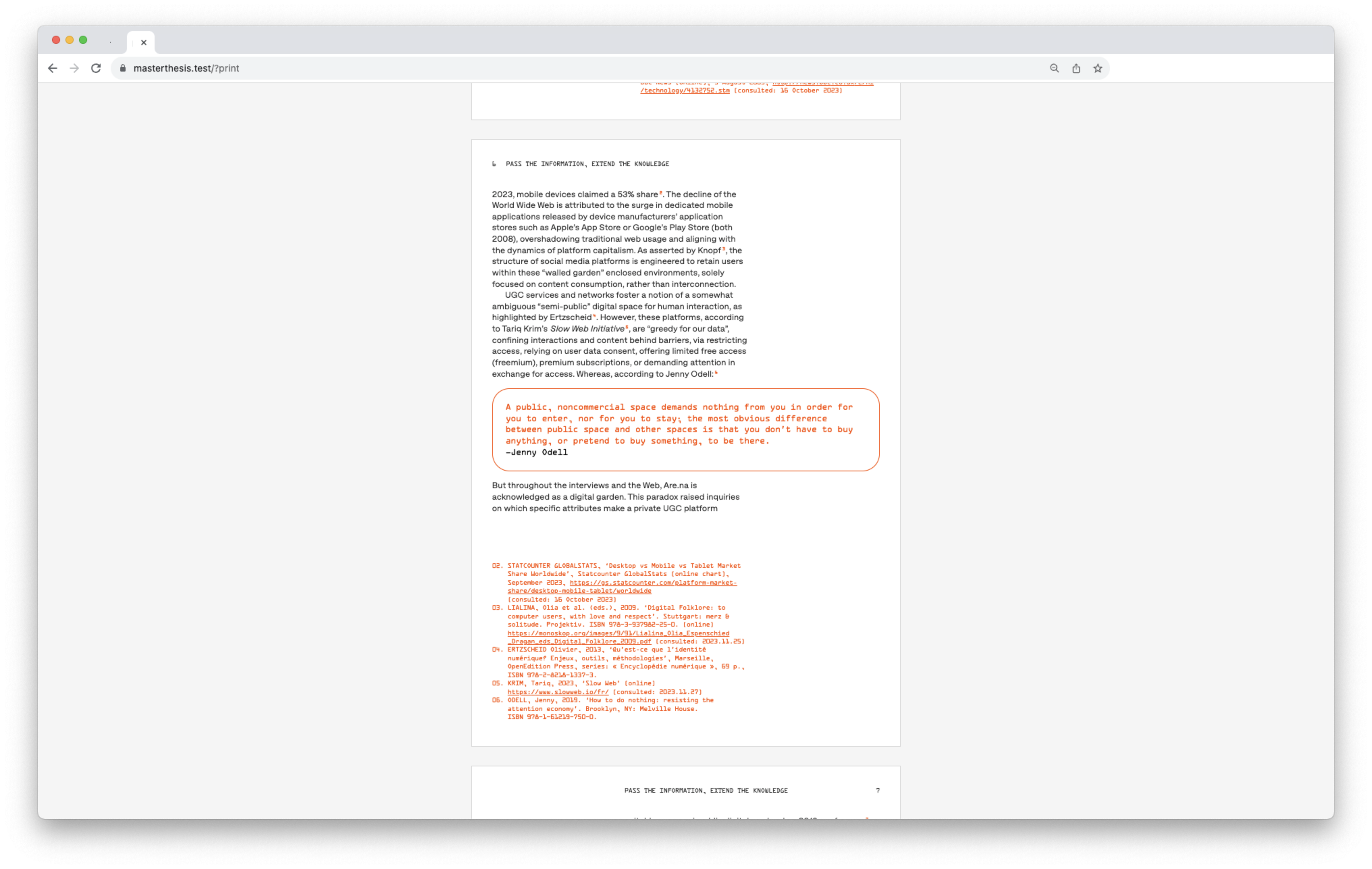 This MA thesis is designed as a website-first output, to shape a form meaningfully suitable to its content. Using web-to-print features (more on this process available in the design notes appendice), it allows for anyone to print freely the research in A4, supporting universal access when unfortunately, most academic writings lack a broader audience due to limited online presence, enclosed access to academic platforms, and lack of PDF indexation in search results. In an echo of the aggregated platforms investigated and the digital gardening approach, this thesis was fueled by gathered references in a dedicated public Are