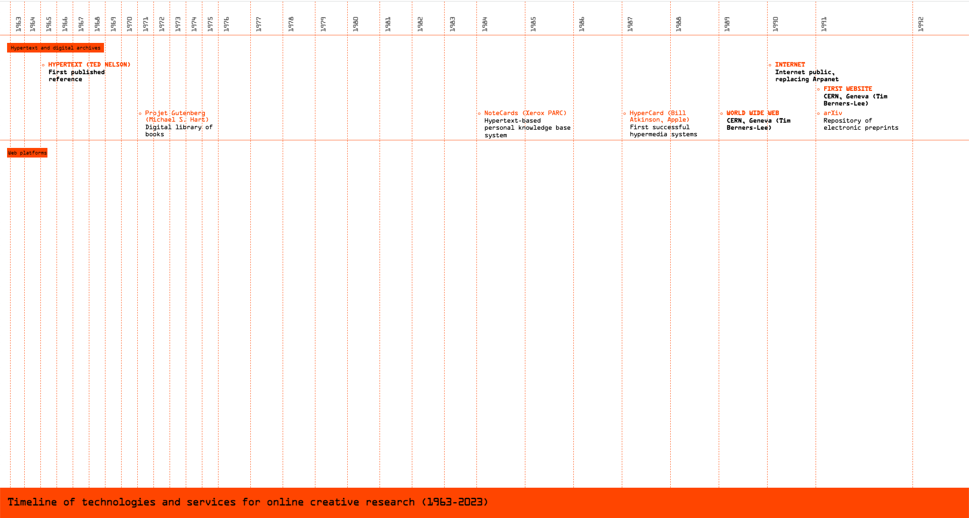 No.1. https:/ [consulted: 2023.11.25] &/ issue1 .shiftspace .pub /on -gathering -mindy -seu #8617;& #65038; HAMON, Amaury, Timeline of technologies and services for online creative research (1963–2023), [online]